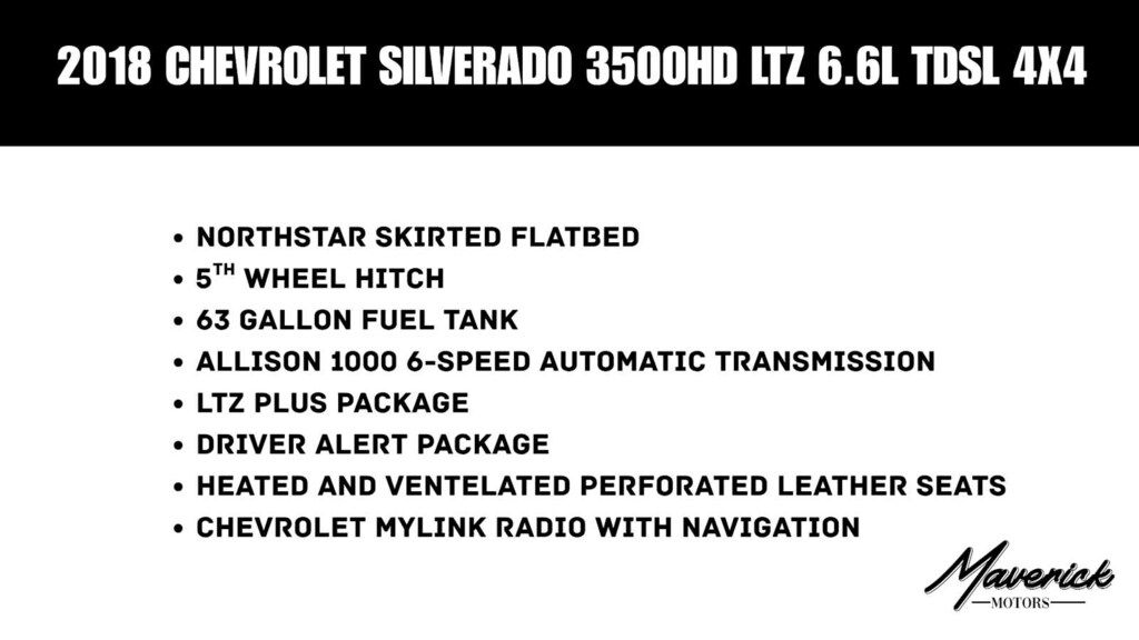 DRIVER ALERT PACKAGE includes (UEU) Forward Collision Alert, Safety Alert Seat, (UFL) Lane Departure Warning and (UD5) Front and Rear Park Assist, LTZ PLUS PACKAGE, FOR CREW CAB AND DOUBLE CAB includes (JF4) power adjustable pedals, (UQA) Bose premium audio system, (UVD) heated leather-wrapped steering wheel and (UD5) Front and Rear Park Assist, SEATING, HEATED AND VENTED PERFORATED LEATHER-APPOINTED FRONT BUCKET, SEATS, FRONT FULL-FEATURE LEATHER-APPOINTED BUCKET WITH (KA1) HEATED SEAT CUSHIONS AND SEAT BACKS. Includes 10-way power driver and front passenger seat adjusters, including 2-way power lumbar control, 2-position driver memory, adjustable head restraints, (D07) floor console storage pockets and (K4C) wireless charging. BED LINER, SPRAY-ON Pickup box bed liner with bowtie logo. Liner is permanently bonded to the truck bed providing a water tight seal. The textured, non-skid surface is black in color and robotically applied. Spray-on liner covers entire bed interior surface below side rails, including tailgate, front box top rail, gage hole plugs and lower tie down loops. AUDIO SYSTEM, CHEVROLET MYLINK RADIO WITH NAVIGATION AND 8 DIAGONAL COLOR TOUCH-SCREEN, AM/FM STEREO with seek-and-scan and digital clock, includes Bluetooth® streaming audio for music and select phones; USB ports; auxiliary jack; voice-activated technology for radio and phone; and Shop with the ability to browse, select and install apps to your vehicle. Apps include Pandora, iHeartRadio, The Weather Channel and more. AIRBAGS, CREW CAB: SINGLE-STAGE FRONTAL AIRBAGS FOR DRIVER AND FRONT OUTBOARD PASSENGER; SEAT-MOUNTED SIDE-IMPACT AIRBAGS FOR DRIVER AND FRONT OUTBOARD PASSENGER; HEAD-CURTAIN AIRBAGS FOR FRONT AND REAR OUTBOARD SEATING POSITIONS, GOOSENECK / 5TH WHEEL PREP PACKAGE -- HITCH PLATFORM TO ACCEPT GOOSENECK OR FIFTH WHEEL HITCH. Includes Hitch platform with tray to accept ball and drilled box holes with caps installed, box mounted 7-pin trailer harness (similar to (UY2) harness). GVWR, 13,025 LBS. (5908 KG) WITH DUAL REAR WHEELS, ENGINE, DURAMAX 6.6L TURBO-DIESEL V8, B20-DIESEL COMPATIBLE (445 hp [332 kW] @ 2800 rpm, 910 lb-ft of torque [1220 Nm] @ 1600 rpm) Includes capped fuel fill, (K40) exhaust brake and (K05) engine block heater. TRANSMISSION, ALLISON 1000 6-SPEED AUTOMATIC, ELECTRONICALLY CONTROLLED with overdrive, electronic engine grade braking and tow/haul mode, STEERING WHEEL, HEATED, LEATHER WRAPPED WITH AUDIO AND CRUISE CONTROLS, LPO, ASSIST STEPS - 6 CHROMED RECTANGULAR.