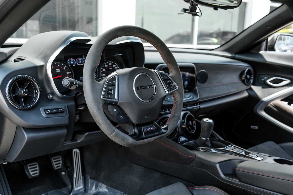 ZL1 1LE EXTREME TRACK PERFORMANCE PACKAGE includes (FEA) Performance Suspension with DSSV dampers, Red calipers, (DSM) Satin Black hood wrap, (CFW) exposed Carbon Fiber weave hood insert, (T42) exposed weave carbon fiber rear spoiler, low-gloss Black outside rearview mirrors, dark tail lamps, front dive planes, unique front splitter with lower DRL deleted, (R6O) 305/30R19 front and 325/30R19 rear, blackwall, summer-only tires, (PKJ) 19 x 11 front and 19 x 12 rear low gloss Black-painted forged aluminum wheels, (A62) rear fixed seat, and specific ratios when 6-speed manual transmission is ordered, SEATS, LEATHER-TRIMMED WITH SUEDED INSERTS FRONT BUCKET, RECARO PERFORMANCE (STD), AUDIO SYSTEM, CHEVROLET INFOTAINMENT 3 PLUS SYSTEM, 8 DIAGONAL HD COLOR TOUCHSCREEN, AM/FM STEREO Bluetooth® audio streaming for 2 active devices, Apple CarPlay® and Android Auto® capable, voice recognition, in-vehicle apps, cloud connected personalization for select infotainment and vehicle settings. Subscription required for enhanced and connected services after trial period. (STD), ENGINE, 6.2L SUPERCHARGED V8 DI, VVT (650 hp [485 kW] @ 6400 rpm, 650 lb-ft torque [881N-m] @ 3600 rpm) (STD), TRANSMISSION, 6-SPEED MANUAL (Includes Active Rev Matching.) (STD).
