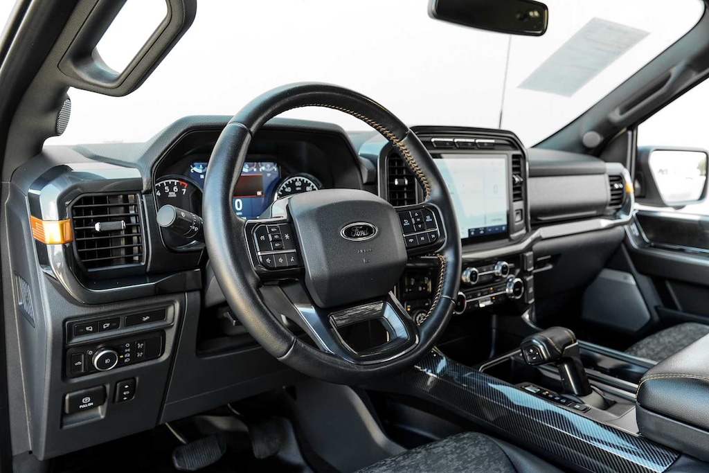 EQUIPMENT GROUP 401A MID Onboard 400W Outlet, 1 outlet in the IP, 2nd outlet in the console and an additional outlet in the bed, Dual Zone Electronic Automatic Temperature Control, Power Glass Heated Sideview Mirrors, manual folding, turn signal and black skull caps, Auto-Dimming Rearview Mirror, Extended Range 36 Gallon Fuel Tank, Heated Front Seats, Body-Color Door Handles w/Body-Color Bezel, Ford Co-Pilot360 2.0, Reverse Sensing System, Post-Collision Braking, Reverse Brake Assist, BLIS w/Cross Traffic Alert, Trail Control, trail 1-pedal drive and trail turn assist, Zone Lighting, Leather-Wrapped Steering Wheel, active orange stitching, Intelligent Access w/Push Button Start, approach detection, SecuriCode Drivers Side Keyless-Entry Keypad, Remote Start System w/Remote Tailgate Release, BED UTILITY PACKAGE BoxLink, 4 premium locking cleats, Zone Lighting, LED Box Lighting, Tailgate Step w/Tailgate Work Surface, Power Tailgate, 360 DEGREE CAMERA trailer reverse guidance, RADIO: B&O SOUND SYSTEM BY BANG & OLUFSEN HD radio and 8 speakers including subwoofer, FRONT-AXLE W/TORSEN DIFFERENTIAL, TRANSMISSION: ELECTRONIC 10-SPEED AUTOMATIC selectable drive modes: normal, ECO, sport, tow/haul, slippery, deep snow/sand and mud/rut (STD).