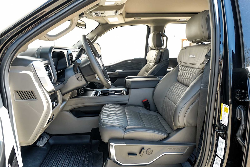 satin chrome tailgate applique, front premium suede wrapped pillars, front premium leather interior grab handles and upgraded floor mat accents matching premium interior theme, Platinum Plus experience includes premium maintenance plan - coverage up to 2 years or 25,000 miles (whichever comes first), Covers routine inspections, preventive care, and replacement of normal wear and tear items that require periodic attention, elite welcome call, welcome package and tribute item, accessories discount (90 day window), FordPass rewards upgrade tier and 1:1 texting w/Ford truck expert, Premium Venetian Leather Door Panel, applied French stitching, Upfitter Switches (6), Located in overhead console, Illuminated Scuff Plates, Premium Leather IP Topper, upgraded Microwelt application, Twin Panel, tailgate-guard, black box bed tie-down hooks and black bed attachment bolts, SelectShift and selectable drive modes: normal, eco, slippery roads, tow/haul and off-road (STD).