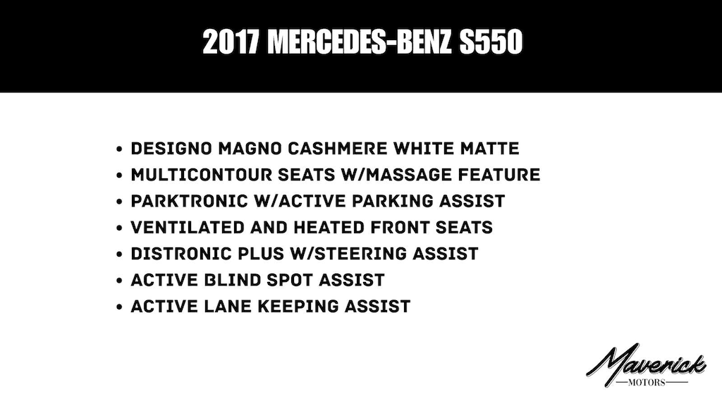 Navigation, Panoramic Roof, Power Liftgate, Back-Up Camera, Premium Sound System. Mercedes-Benz S 550 with designo® Magno Cashmere White (Matte Finish) exterior and Porcelain/Black interior features a 8 Cylinder Engine with 449 HP at 5250 RPM*.