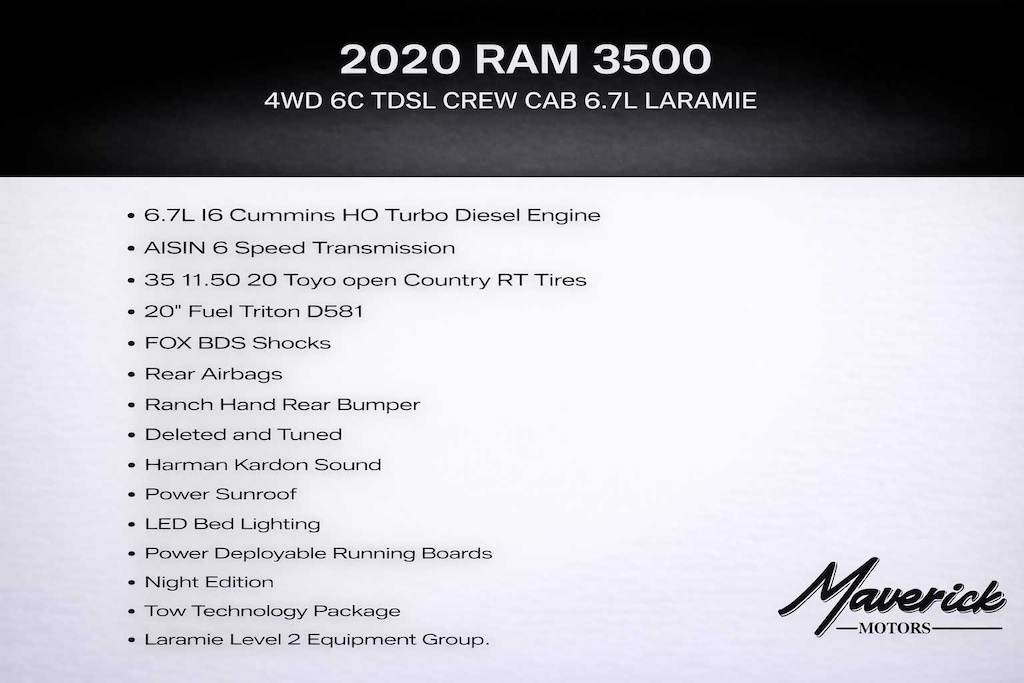 ENGINE: 6.7L I6 CUMMINS HD TURBO DIESEL Selective Catalytic Reduction (Urea), Dual 730 Amp Maintenance Free Batteries, Cummins Turbo Diesel Badge, Heavy Duty Engine Cooling, Supplemental Heater, 220 Amp Alternator, GVWR: 12,300 lbs, Current Generation Engine Controller, Diesel Exhaust Brake, Capless Fuel Fill w/o Discriminator, LARAMIE LEVEL 2 EQUIPMENT GROUP Blind Spot & Cross Path Detection, Power Chrome Tow Mirrors w/Convex Spotter & Memory, Mirror-Mounted Aux Reverse Lamps, Exterior Mirrors w/Memory, Power Adjustable Convex Aux Mirrors, Rain Sensitive Windshield Wipers, Power Adjustable Pedals w/Memory, Radio: Uconnect 4C Nav w/8.4 Display, SiriusXM Traffic Plus, Disassociated Touchscreen Display, HD Radio, For Details Visit DriveUconnect.com, 1-Year SiriusXM Guardian Trial, GPS Navigation, SiriusXM Travel Link, Ventilated Front Seats, Media Hub w/2 Charge Only USBs, Remote Tailgate Release, 17 Speaker harman/kardon Premium Sound, Auto High Beam Headlamp Control, Heated Second Row Seats, Foam Bottle Insert (Door Trim Panel), 2nd Row In, DUAL REAR WHEELS Clearance Lamps, Tires: LT235/80R17E BSW AS, Tire Pressure Monitoring Delete, 17 Steel Spare Wheel, Box & Rear Fender Clearance Lamps, 6000# Front Axle w/Hub Ext, Wheels: 17 x 6.0 Polished Aluminum, GVWR: 14,000 lbs, TOWING TECHNOLOGY GROUP CTR Stop Lamp w/Cargo View Camera, Mirror-Mounted Aux Reverse Lamps, Surround View Camera System, Exterior Mirrors w/Memory, Power Chrome Tow Mirrors w/Convex Spotter & Memory, Trailer Reverse Guidance, Power Adjustable Convex Aux Mirrors, SAFETY GROUP Adaptive Cruise Control w/Stop, Adaptive Steering System, Full Speed Forward Collision Warning Plus, Lane Keep Assist, POWER SUNROOF, POWER DEPLOYABLE RUNNING BOARDS, BLACK, LEATHER TRIMMED BUCKET SEATS Bucket Seats, Power 2-Way Passenger Lumbar Adjust, Power 2-Way Driver Lumbar Adjust, Full Length Upgraded Floor Console, TRANSMISSION: 6-SPEED AUTOMATIC AISIN AS69RC HD 12.0 Single Rear Wheel Axle, Transmission Oil Cooler, Chrome Accent Shift Control.